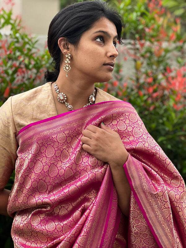 She walks in beauty, bedazzling in a lush, floral weave, the cynosure of all eyes, of those who surround her, gazing on in silent admiration. Grace and elegance abound as she wends her way through, greeting one and all, knowing she’s captivated them all. A treasure to own. A rare and special gem, this floral drape.