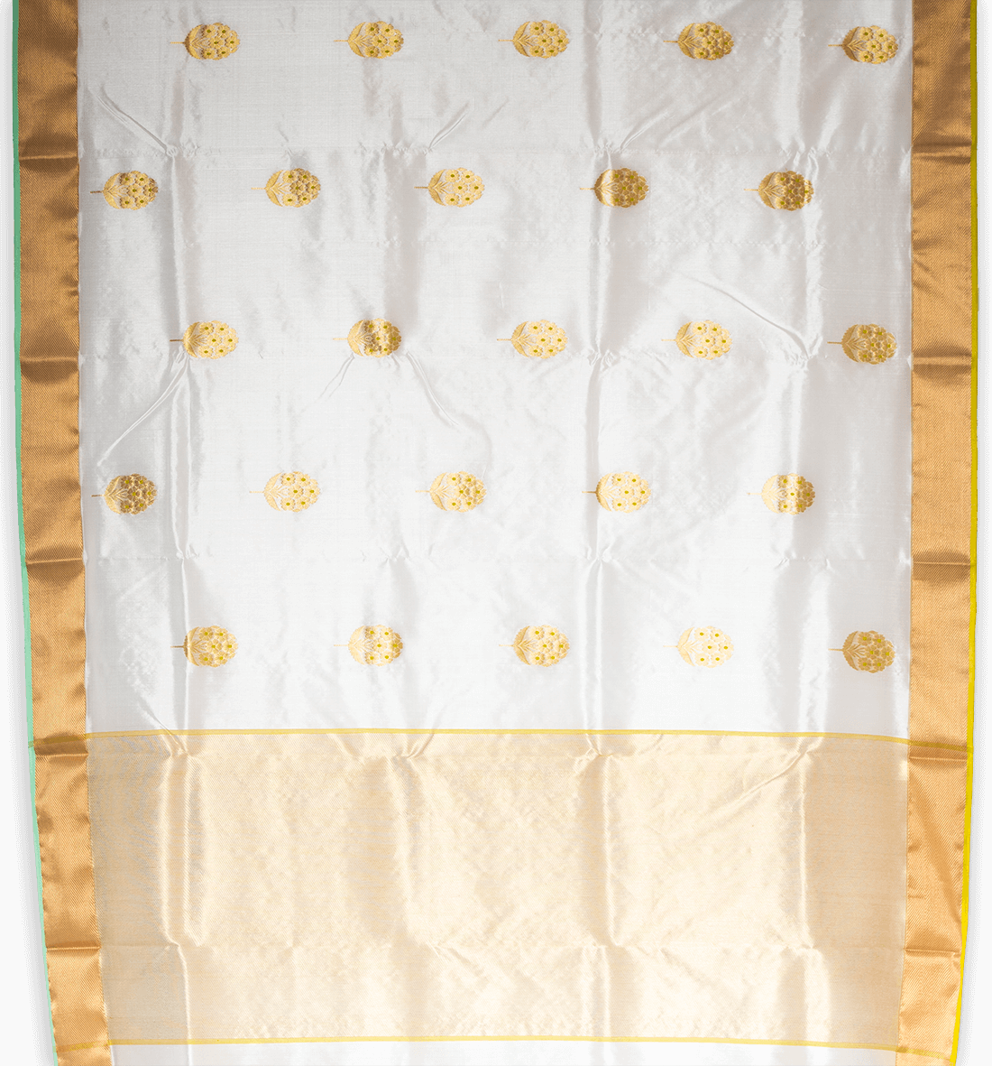This saree has intricate golden floral motifs decoratively woven on ivory silk and is edged with lime green on one side and aqua on the other. Chanderi hosts one of the most famous of handloom clusters and is the home of the much sought after hand woven sarees in silk, silk cotton and cotton.