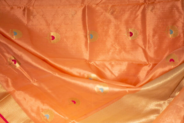 Intricately woven motifs grace a bed of Peachy Orange soft silk, creating a resplendent and glamorous saree. Chanderi hosts one of the most famous of handloom clusters and is the home of the much sought after hand woven sarees in silk, silk cotton and cotton.